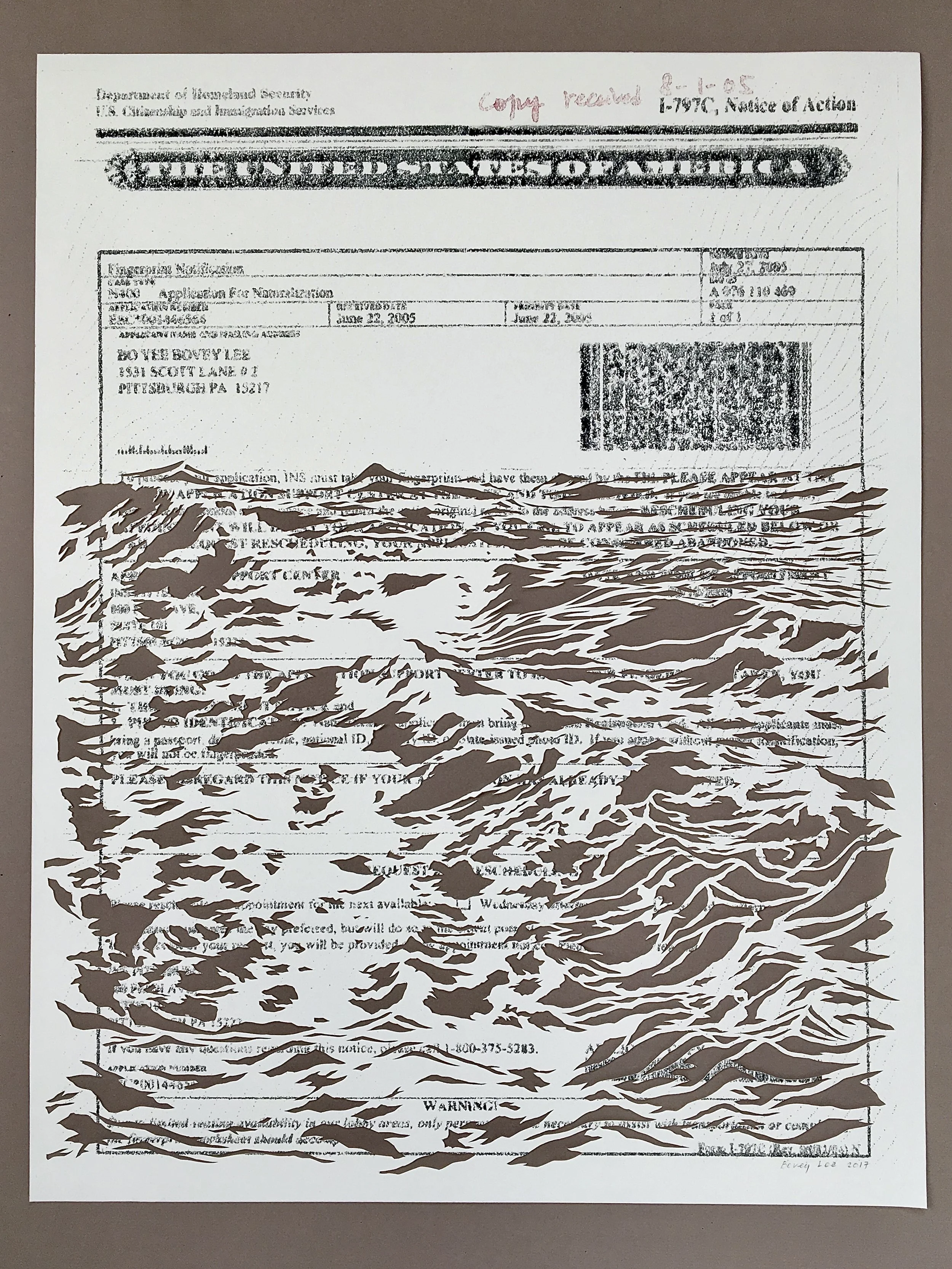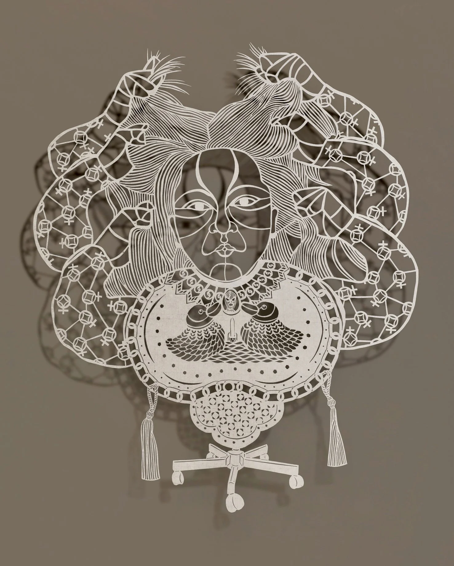 “As a female artist trained in both Chinese calligraphy and American digital arts, Lee creates a ‘papercutting about papercutting,’ reflecting the tension between freedom and confinement, tradition and modernity.”